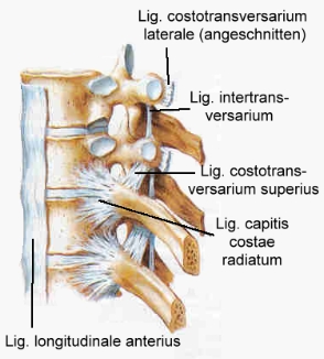 Das Gelenk Articulatio costotransversaria liegt zwischen den Gelenkflächen der Querfortsätze und des Rippenhöckers. Auch dieses Gelenk wird durch Bänder gesichert : Das Lig. costotransversarium verbindet den Rippenhals mit dem angrenzenden Querfortsatz. Das Lig. costotransversarium superius liegt zwischen Rippenhals und Querfortsatz der nächsthöheren Rippe. Lig. costotransversarium laterale verbindet das Ende des Querfortsatzes mit dem entsprechenden Rippenhöckerteils, das keine Gelenkfläche besitzt.